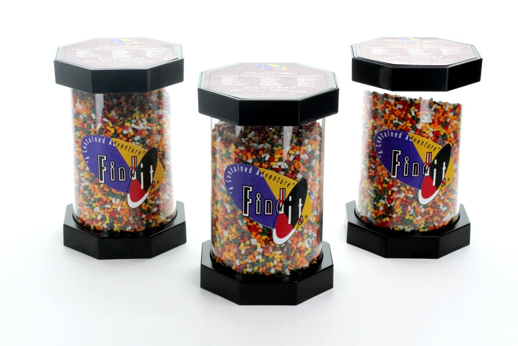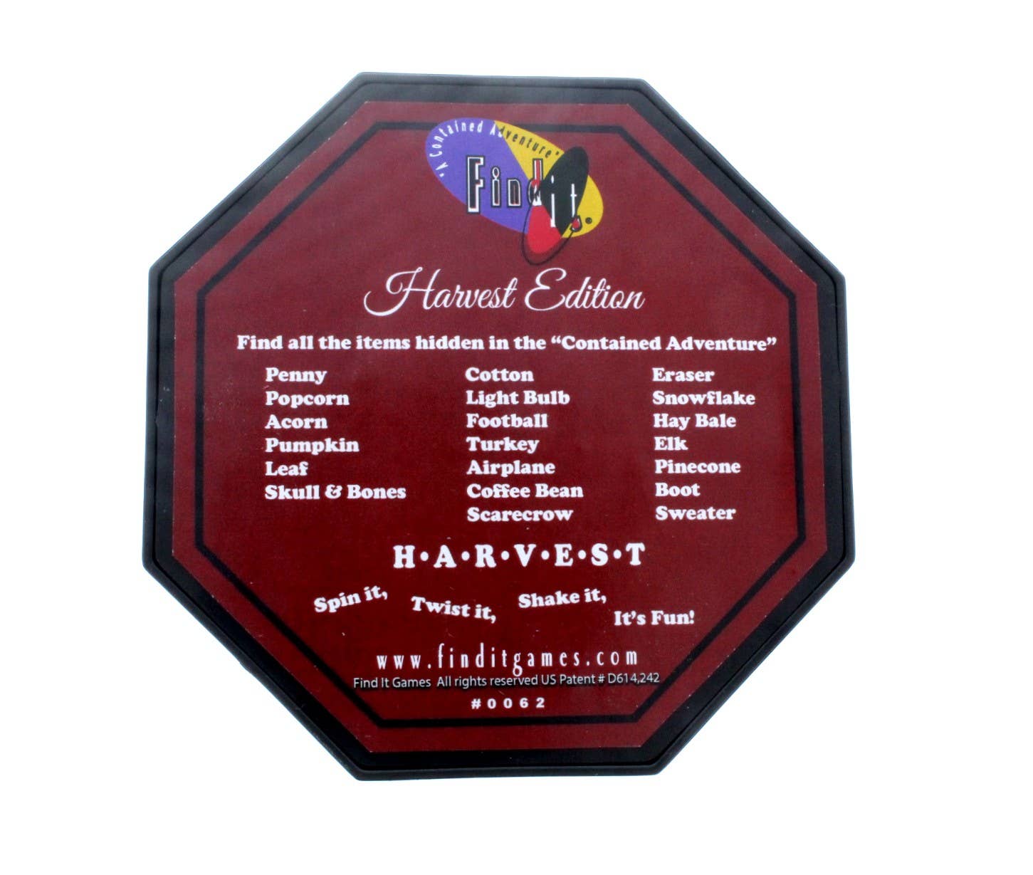 Find it® “Harvest Edition” is a grab and go smaller version of our full-sized games at 5.5 inches in height and 3 inches in circumference it is loaded with fun . There are 27 Fall related items hidden inside an assortment of beautiful colors nature provides during the Fall Season. In this version you will find things that immediately remind you all your favorite Fall activities and memories. There is an assortment of items from a pumpkin, leaf, football, coffee bean, and even a hay bale. The elusive penny is also hidden somewhere within all those things. All items are listed on top of the game. Find it® “Harvest Edition” is offered as grab and go only, sold in cases of 12 with no box or check off pad. There is a printable check off list available on our website. www.finditgames.com. All Find It Games are proudly assembled in the USA
